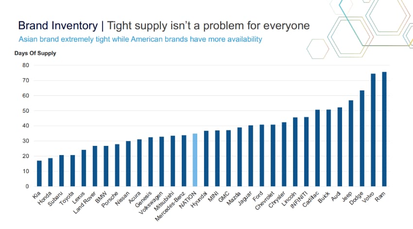 If you sell new products from Ford, GM, or Stellantis, maybe Cox Automotive's latest info on brand availability comes as no surprise. Among the heaps of data in the company's latest mid-year report is a look at how the different automakers stack up when it comes to U.S. inventory.