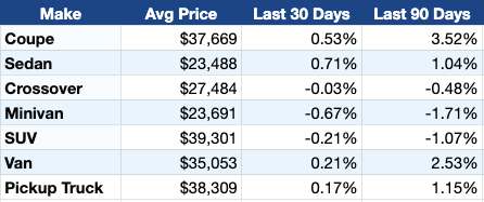 We’ll skip our deep dive into the CarGurus used vehicle price index but briefly share that the average pre-owned car sold for $30,946 (a $5 bump from last week). Instead, we’ll look at similar data from a different source.
